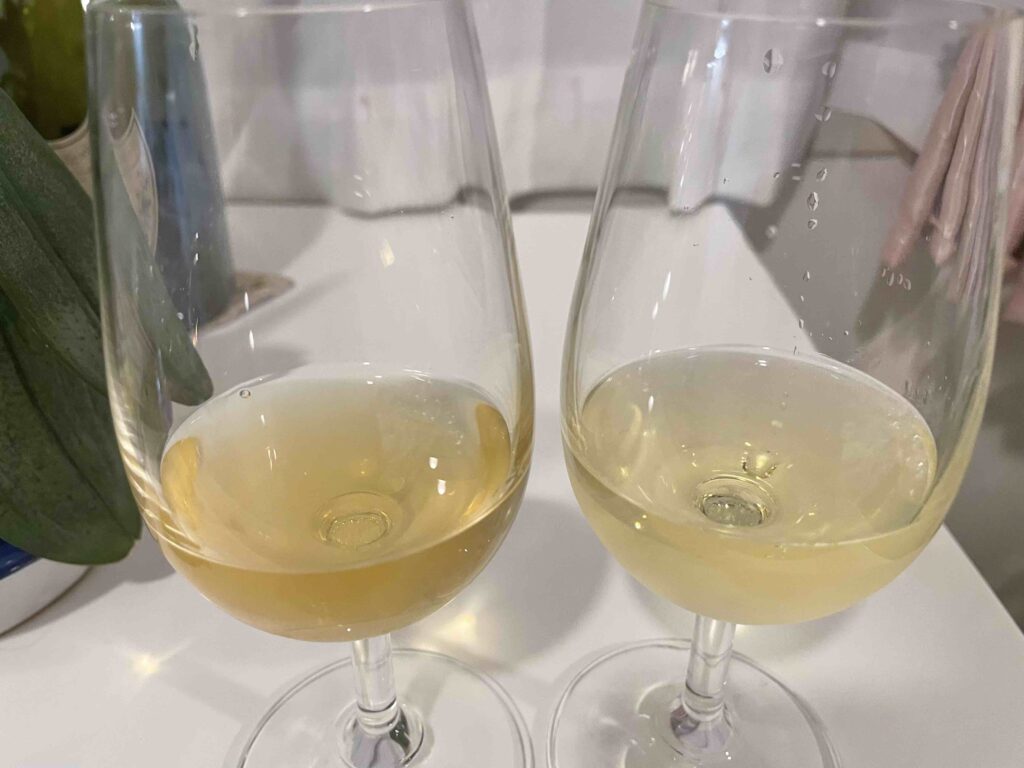 グラスに注ぐと、淡く澄んだレモンイエローの色調が、爽やかで清潔感のある印象を与える。香りは立ち上がりから華やかで、白桃やパイナップル、メロン、ライチといったトロピカルフルーツのアロマが豊かに広がる。いずれも完熟した果実を思わせる甘やかな香りだが、決して重たくなく、軽快なフローラルさも感じられる。口に含むと、まずキリッとした酸が印象的で、香りの甘やかさとは対照的に味わいはドライ。果実のジューシーさとともに、舌の奥にかすかに残る苦味が味わいに奥行きを与えている。中盤から後半にかけては、ほのかにヴァニラや蜂蜜のニュアンスが現れ、香りの複雑さと調和しながら余韻を引き立てる。香りは甘美でありながら、味わいはシャープで引き締まった食事に合わせやすいワイン。